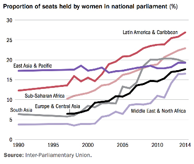 More women are participating in public life and decision making at the highest levels than in 1990, based on the proportion of parliamentary seats held by women. Latin America and the Caribbean leads developing country regions in 2014, at 29 percent, followed closely by Sub-Saharan Africa at 22 percent. The biggest change has occurred in the Middle East and North Africa, where the proportion of seats held by women more than quadrupled between 1990 and 2014 . At the country level Rwanda leads the way with 64 percent in 2014, higher than the percentage for high- income countries, at 26 percent.