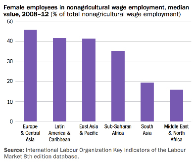 Asia and the Middle East and North Africa and has risen only marginally over the years. The share of women’s employment in the nonagricultural sector is highest in Europe and Central Asia, where it almost equals men’s.