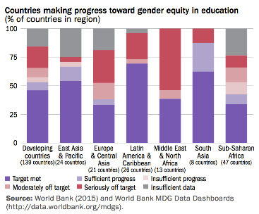 However, these averages disguise large differences across regions and countries. About half the countries in the Middle East and North Africa are seriously off track to achieve the target of gender parity. Sub-Saharan Africa and the Middle East and North Africa saw fast progress but continue to have the largest gender disparities in primary and secondary enrollment rates among developing country regions. Given past rates of change, the two regions are unlikely to meet the target of eliminating disparities in education by 2015. -http://blogs.worldbank.org/opendata/mdg3-large-differences-gender-equality-between-and-within-countries