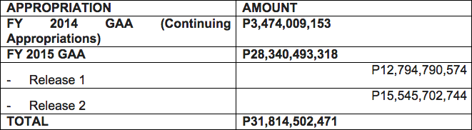 Of the total P31.8 billion, P3.47 billion has been charged against the P44.6-billion FY 2014 GAA BEFF. The P3.47 billion is specifically allocated to the BEFF for the “construction, replacement, and completion of kindergarten, elementary, and secondary school buildings and the construction of water and sanitation facilities,” as stated in the GAA. Likewise, this is supposed to “address remaining shortages and meet the requirements of the K-12 Basic Education Program.”