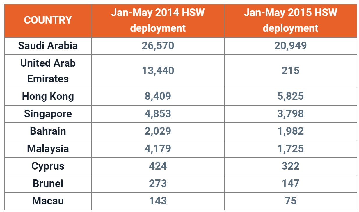 MANILA, Philippines – Philippine deployment of household service workers (HSWs) to foreign countries went down by 20% in the past 5 months compared to the same period in 2014.