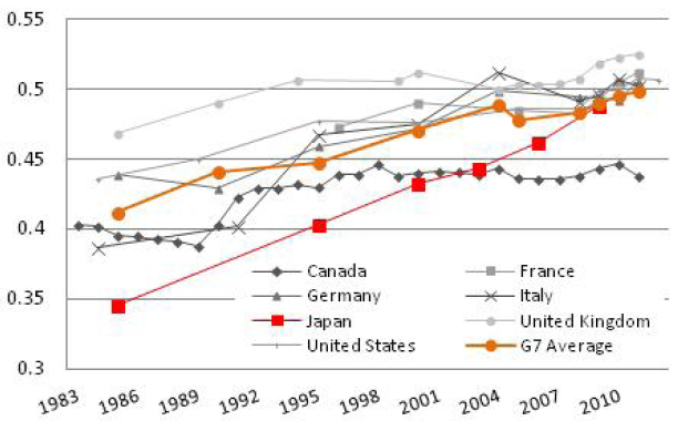 Japan is not immune from the increase in inequality observed in other advanced countries in recent years. Anecdotal evidence suggests that concerns over income inequality have grown among the Japanese population, and the previously widely held notion that ‘all Japanese are middle class’ is a thing of the past. As seen in Figure 1 when measured using the Gini coefficient (before fiscal redistribution), inequality in Japan has steadily increased over the last three decades. The latest available figure implies that income inequality in Japan, starting from the lowest among the G7 countries in the mid-1980s, has converged to nearly the G7 average of 0.50.
