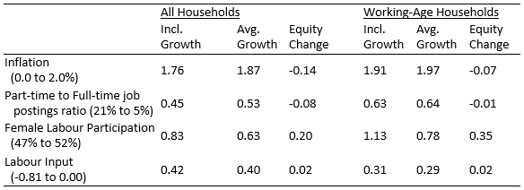 However, the overall impact of reaching the 2% inflation target on our inclusive growth measure is positive, because the ‘growth’ effect of permanently getting out of deflation (which stimulates growth by changing expectations and raising incentives to consume and invest) more than offsets the negative impact of inflation on equality. Table 1 also shows that for working-age households, the negative equity effect is smaller, and the positive growth effect is stronger, compared to the sample of all households.