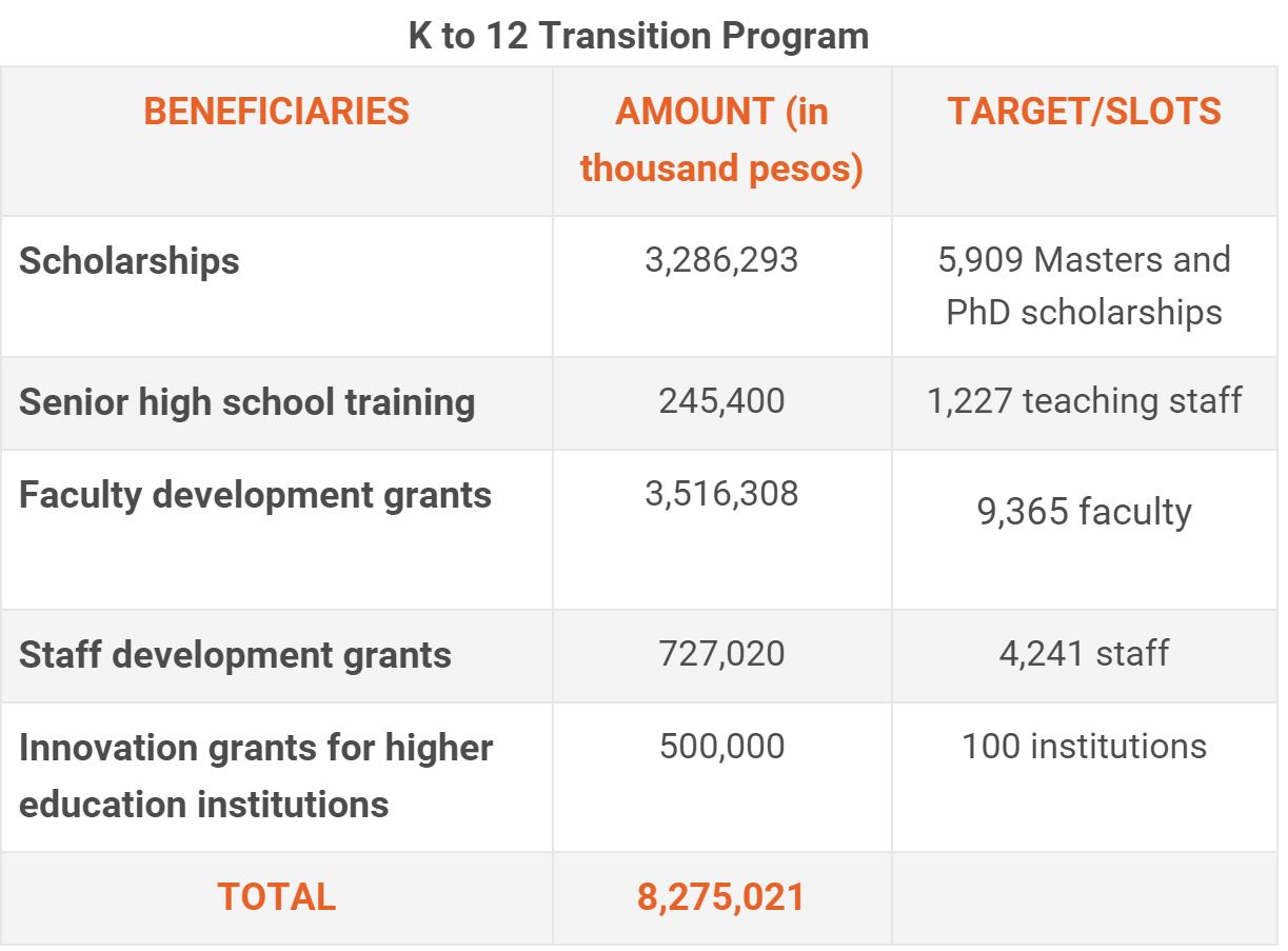 From the proposed budget, P8.28 billion ($177.42 million) will be allocated for the commission’s K to 12 Transition Program, which has 5 components: