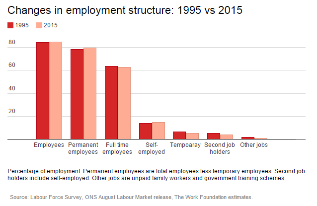 Similarly, longer run trends do not suggest a profound shift in employment. The chart below shows the change in employment shares between 1995 and 2015 from the household Labour Force Survey.