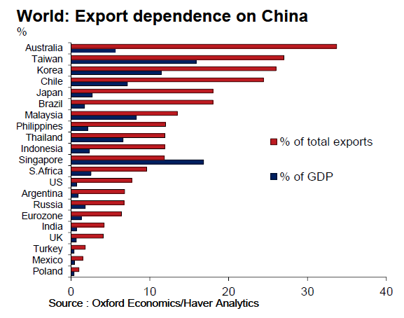 Then there’s the indirect effects as the drag on GDP of China’s trading partners works through the global economy. For instance, Japan would not only suffer from weaker exports to China but also to Korea and other Asian trading partners affected by China’s slowdown, the Oxford Economics research shows.