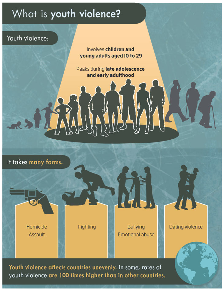 “Worldwide, an estimated 200,000 homicides occur each year among youth and young adults aged 10-29 years, making homicide the fourth leading cause of death in this age group,” said the WHO report entitled Preventing youth violence: an overview of the evidence.