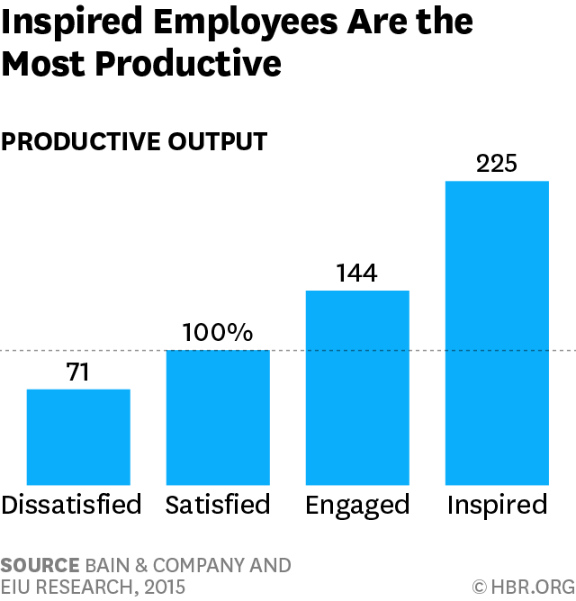 In the research, we surveyed over 300 senior executives from companies all over the world. We asked them to assess, based on their impressions of employee output, the relative productivity of dissatisfied, satisfied, engaged, and inspired employees. The results point to the productive power of an engaged and inspired workforce. If satisfied employees are productive at an index level of 100, then engaged employees produce at 144, nearly half again as much. But then comes the real kicker: inspired employees score 225 on this scale. From a purely quantitative perspective, in other words, it would take two and a quarter satisfied employees to generate the same output as one inspired employee.