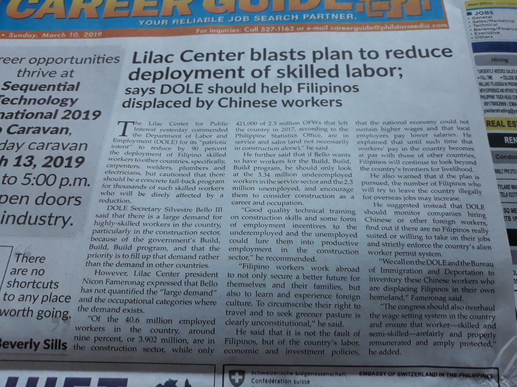 Lilac center blasts plan to reduce deployment of skilled labor; says DOLE should help Filipinos displaced by Chinese workers